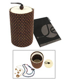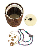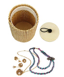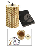 Keep your rings organized while traveling with this cute and compact bamboo jewelry box. The long round shaped case features a bamboo exterior. The case has a lid that can be completely pulled off by the top string. The bamboo on the outside gives the case a unique look that is perfect for home and for travel. The case is the perfect accessory to store your jewelry in. The compact size makes the case perfect to travel with. The case is also perfect to use at home. Cute and compact, this bamboo jewelry case is the perfect travel accessory for your rings or earrings.